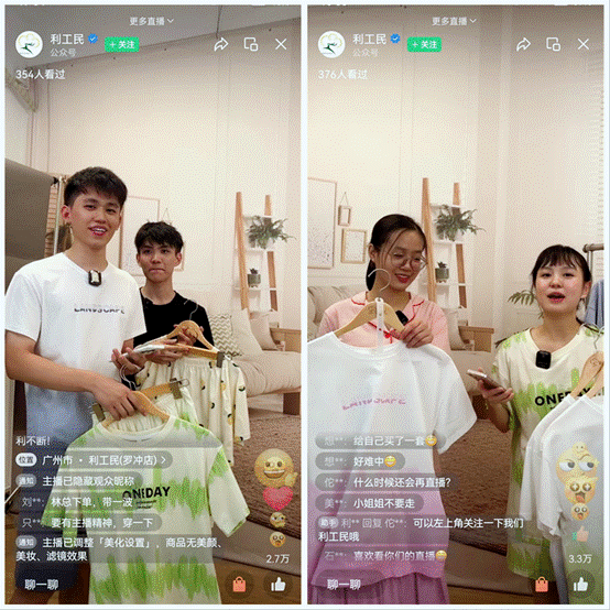 “歡迎家人們來到我們利工民直播間,點個關注不迷路,我們利工民是中華老字號……”紡織公司秉承培育新人的理念,成功舉辦了一場精彩紛呈的新員工直播營銷大賽。紡織公司2023年新員工分為四支隊伍、化身為帶貨主播,在利工民微信視頻號直播間通過講解家居服材質(zhì)用料、款式設計等內(nèi)容,吸引顧客下單,開啟直播帶貨。