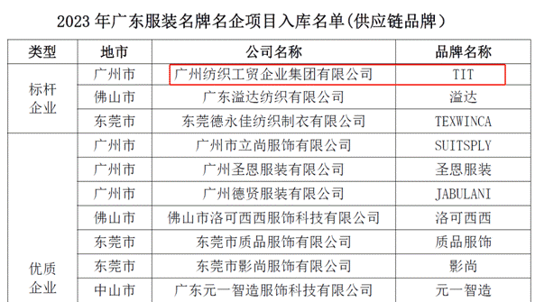 喜報(bào):紡織公司成功入選“2023年廣東服裝名牌名企項(xiàng)目入庫(kù)名單(供應(yīng)鏈品牌)”