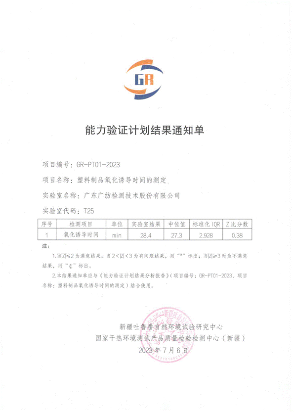 近日,廣紡檢測收到參加新疆吐魯番自然環(huán)境試驗研究中心、國家干熱環(huán)境測試產品質量檢驗檢測中心(新疆) 實施的“塑料制品氧化誘導時間的測定”能力驗證結果滿意通知單。