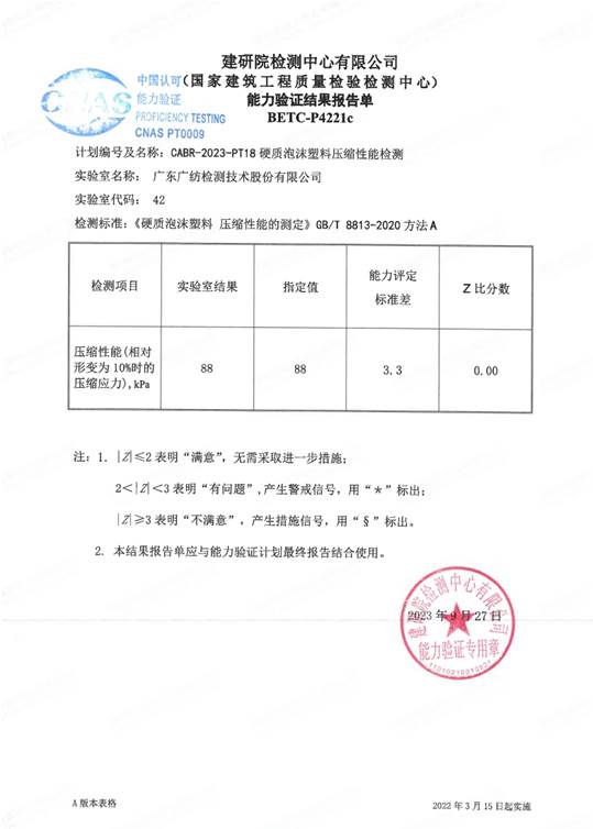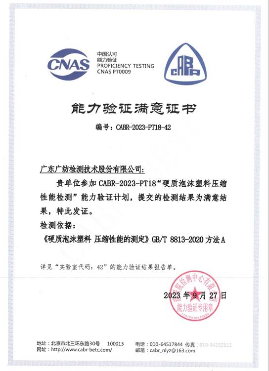 喜報(bào):廣紡檢測(cè)參加“硬質(zhì)泡沫塑料 壓縮性能的測(cè)定”能力驗(yàn)證結(jié)果滿(mǎn)意