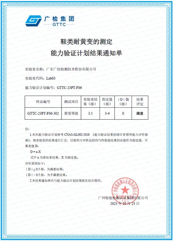 近日,廣東廣紡檢測技術(shù)股份有限公司收到參加廣檢集團(tuán)組織的能力驗(yàn)證計劃結(jié)果通知單:“鞋類耐黃變的測定”及“紡織品洗滌和干燥后尺寸變化的測定”兩個項目結(jié)果滿意。