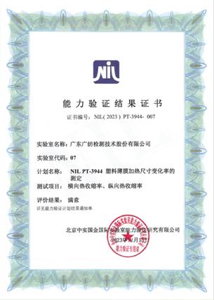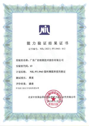 近日,廣東廣紡檢測(cè)技術(shù)股份有限公司收到北京中實(shí)國(guó)金國(guó)際實(shí)驗(yàn)室能力驗(yàn)證研究有限公司“NIL PT-3943塑料薄膜厚度的測(cè)定、NIL PT-3944塑料薄膜加熱尺寸變化率的測(cè)定”兩份能力驗(yàn)證結(jié)果滿意證書。