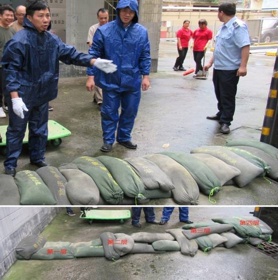 演練設(shè)想突發(fā)暴雨災(zāi)害導(dǎo)致廣德大廈停車場地下車庫水位迅速升高,車場入口雨水倒灌,危及車輛和升降設(shè)備安全,要迅速防洪排洪解除危險。在應(yīng)急指揮中心下達指令后,各演練分組迅速到位,立即啟動車場地下車庫排水泵,搶險人員穿上水鞋和雨衣,用推車搬運沙袋到車庫入口堆放,阻擋對面馬路的雨水倒灌入車場,雨水過后清潔人員清理現(xiàn)場淤泥,恢復(fù)生產(chǎn)。