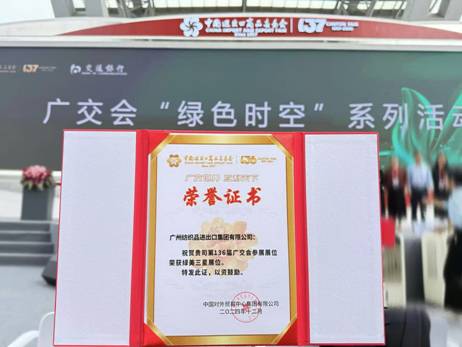 廣交會二期展會首日,在大會舉辦的“綠色時空”頒獎儀式上,紡出公司家具展位設(shè)計因突出的環(huán)保理念和創(chuàng)新實踐榮獲“綠美展位優(yōu)秀案例”稱號,公司代表出席并登臺領(lǐng)取了“綠美三星展位”榮譽證書,彰顯紡出公司在戶外生活領(lǐng)域的創(chuàng)新實力和環(huán)保承諾。