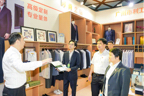 在共建活動中,大家來到廣東時裝周的利工民主題展位前,深入了解利工民服裝定制業(yè)務(wù)開展情況。廣東省服裝服飾行業(yè)協(xié)會黨支部書記劉岳屏介紹了目前廣東服裝定制的整體情況以及相關(guān)智能制造企業(yè)情況。雙方就如何加強(qiáng)資源共享,促進(jìn)服裝定制服務(wù)做強(qiáng)做大,助力廣東定制“出圈”“破圈”進(jìn)行了交流探討。