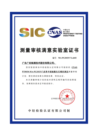 喜報!廣紡檢測成功通過中輕檢驗認證組織的CNAS PT0038-MA-PG202517 皮革中短鏈氯化石蠟測定測量審核,取得“結(jié)果滿意證書”!