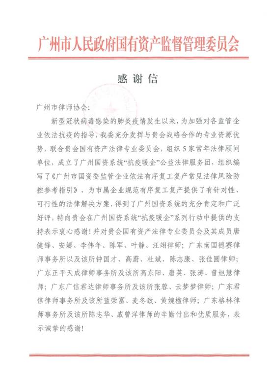 服務(wù):充分發(fā)揮專業(yè)優(yōu)勢,助力復(fù)工復(fù)產(chǎn)。紡織公司汪翊律師作為廣州市律師協(xié)會國有資產(chǎn)法律專業(yè)委員會的成員之一,積極投身廣州國資系統(tǒng)“抗疫暖企”公益法律服務(wù)團(tuán),參與編寫了《廣州市國資委監(jiān)管企業(yè)依法有序復(fù)工復(fù)產(chǎn)常見法律風(fēng)險防控參考指引》, 并得到廣州市國資委的誠摯感謝。